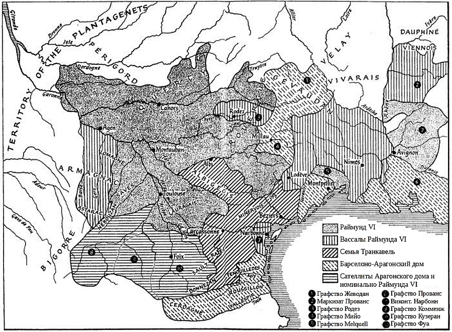 Кто были эти вассалы? Графы Фуа, хотя номинально и причислялись к ним, управляли княжеством, которое располагалось в Пиренеях, и на практике не признавали никакого сюзеренитета, кроме своего собственного. Размеры их территории колебались при каждом изменении их политической судьбы, но к концу XII века они прочно укрепились на севере до Памье и оспаривали владение Савердёном у Раймунда V Тулузского. К востоку от графства Фуа располагалась небольшая, но богатая территория Нарбона, чьи виконты, якобы чиновники Тулузского дома, на самом деле были независимыми наследственными князьями с начала X века. Их непростые отношения с соседями и постоянные ссоры с архиепископом Нарбона были источником нестабильности в регионе, имевшем большое торговое и стратегическое значение. Более амбициозными и могущественными, чем любой из этих князей, были виконты Безье из рода Транкавелей. Как и виконты Нарбона, они были, по сути, чиновниками. Но в X веке их должности стали наследственными, и они, используя сочетание династических браков и вооруженной силы, постепенно присоединили к своим владениям Агд, Ним, Альби, Каркассон и Разес. В момент смерти Бернарда-Атона IV в 1130 году Транкавели, несомненно, были более могущественными, чем графы Тулузы. Их княжество простиралось от Тарна до Пиренеев, разделяя владения Тулузского дома на две части и угрожая самой Тулузе.