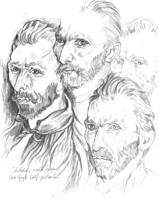 Несколько карандашных набросков, которые я сделал с различных автопортретов Винсента. Все элементы на портретах одинаковые (усы, борода, волосы), но меня поразило, насколько по-разному Винсент видел себя в каждом случае, без всякого тщеславия искажая свое лицо.