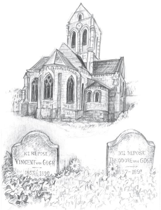 Церковь в Овер-сюр-Уазе, которую Ван Гог прославил на своей картине. Могилы Винсента и Тео. Я нарисовал их на той же странице, хотя на самом деле могилы находятся в десяти-пятнадцати минутах ходьбы от церкви. Карандаш.
