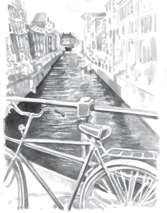 Типичный мост через канал с вездесущими велосипедами, которые в Амстердаме можно увидеть повсюду. Тушь.