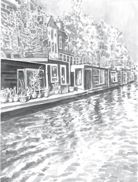 Всего лишь один из множества плавучих домов, выстроившихся вдоль амстердамских каналов, которые мне очень понравились. Тушь.