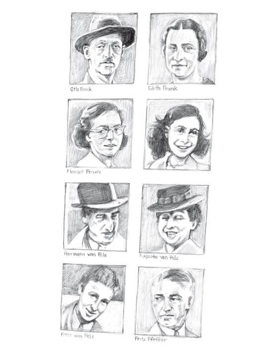 Карандашный набросок, сделанный мной со светового короба с фотографиями восьми жителей, скрывавшихся в доме Анны Франк. Эти портреты поразили меня и запечатлелись в моей душе. Это было похоже на предварительный просмотр актерского состава трагической пьесы.