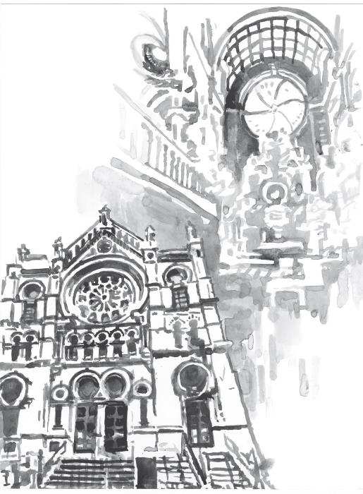 Синагога на Элдридж-стрит, которая кажется несколько неуместной в Нижнем Ист-Сайде, словно случайно забредшая сюда готическая церковь. Эскиз фасада и интерьера тушью.