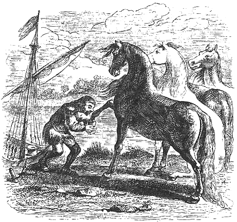 Когда все было готово и наступил день отъезда, я простился с моим хозяином, его супругой и всем семейством. Глаза мои были полны слез, и сердце изнывало от горя. Но его милость, отчасти из любопытства, а быть может, из участия ко мне (если только я вправе сказать так) пожелал увидеть, как я поплыву в моей пироге, и предложил кое-кому из соседей сопровождать его. Около часа мне пришлось ждать прилива. Вскоре поднялся легкий попутный ветер. Заметив это, я решил тотчас же отправиться в путь и поспешил вторично проститься с хозяином. Я собирался пасть ниц, чтобы поцеловать его копыто, но он оказал мне честь, осторожно подняв его к моим губам. Мне известны нападки, которым я подвергся за упоминание этой подробности. Моим клеветникам угодно считать невероятным, чтобы столь знатная особа снизошла до оказания подобного благоволения такому ничтожному существу, как я. (Мне памятна также наклонность некоторых путешественников хвастаться оказанными им необыкновенными милостями.) Но если бы эти критики были больше знакомы с благородством и учтивостью гуигнгнмов, они переменили бы свое мнение.