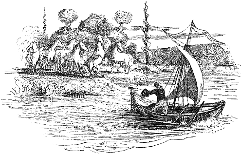 начал это отчаянное путешествие 15 февраля 1714 года в 9 часов утра. Ветер был попутный. Тем не менее сначала я шел на веслах. Но, рассудив, что гребля скоро меня утомит, а ветер может измениться, я отважился поставить свой маленький парус. Таким образом, при содействии отлива, я шел, по моим предположениям, со скоростью полторы лиги в час. Мой хозяин и его друзья оставались на берегу, пока я почти совсем не скрылся из виду. До меня часто доносились возгласы гнедого лошака (он всегда любил меня): «Гнуй илла ниха мэйджах еху» (береги себя хорошенько, милый еху).