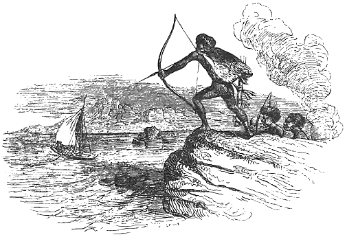 На четвертый день я рискнул пройти немножко дальше в глубь материка. Внезапно в пятистах ярдах от себя я увидел на невысоком холме группу туземцев. Все они – мужчины, женщины и дети – были совершенно голы и сидели около костра. Один из них заметил меня и указал другим. Пятеро мужчин вскочили со своих мест и направились ко мне, оставив женщин и детей у костра. Я со всех ног пустился наутек к берегу, бросился в лодку и отчалил. Дикари, увидя, что я бегу, помчались за мной и, прежде чем я успел отъехать на достаточно далекое расстояние, пустили мне вдогонку стрелу, которая глубоко вонзилась мне в левое колено. Я испугался, как бы стрела не оказалась отравленной. Как только я очутился за пределами досягаемости их стрел (день был очень тихий), я поспешил тщательно высосать рану, а затем кое-как перевязал ее.