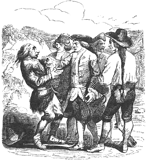 Корабль подошел к этой бухточке на расстояние полулиги и отправил к берегу шлюпку с бочками за пресной водой. По-видимому, на корабле хорошо знали это место. Я лежал между камнями и потому заметил шлюпку лишь тогда, когда она подошла к самому берегу и было слишком поздно искать другого убежища. Высадившись на берег, матросы сразу заметили мою пирогу. Они внимательно осмотрели ее и без труда догадались, что хозяин ее находится где-нибудь поблизости. Четверо из них стали обшаривать каждую щелочку, каждый кустик и наконец нашли меня притаившимся за камнем. Некоторое время они с удивлением смотрели на мой странный и неуклюжий наряд: кафтан из кроличьих шукрок, башмаки с деревянными подошвами и меховые чулки. Тем не менее по этому наряду они заключили, что я не туземец, так как все туземцы ходили голыми. Один из матросов приказал мне по-португальски встать и спросил меня, кто я. Я отлично его понял (так как знаю этот язык) и, поднявшись на ноги, сказал, что я несчастный еху, изгнанный из страны гуигнгнмов, и умоляю позволить мне удалиться. Матросы были удивлены, услышав, что я говорю по-португальски. По цвету моего лица они признали во мне европейца. Но они не могли понять, что я разумел под словами «еху» и «гуигнгнмы». В то же время моя странная манера говорить, напоминавшая конское ржанье, вызывала у них смех. Дрожа от страха и ненависти, я снова стал просить позволения удалиться, тихонько отступая по направлению к моей пироге. Но они удержали меня, пожелав узнать, из какой страны я родом и откуда прибыл сюда. Я ответил им, что я родом из Англии, которую покинул лет пять тому назад, когда их страна и моя были в мире между собой. Поэтому я надеюсь, что они не будут обращаться со мной, как с врагом, тем более что я не хочу им никакого зла. Я просто бедный еху и ищу какого-нибудь пустынного места, где бы провести остаток моей жизни.