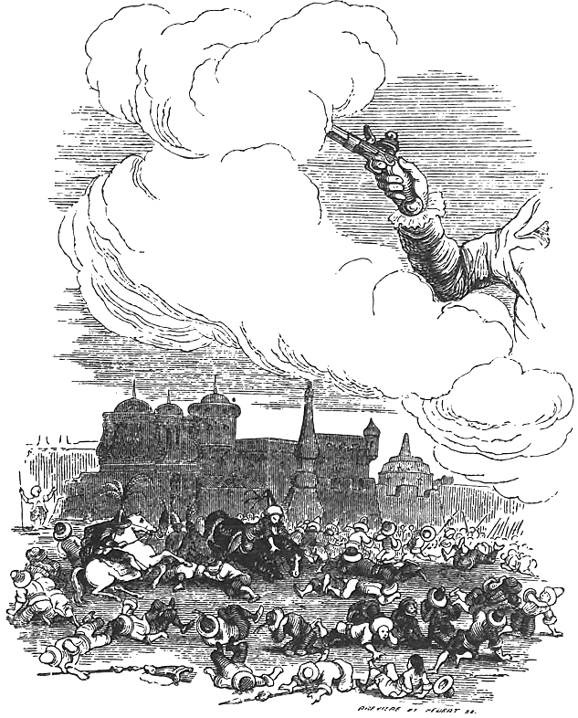 Затем он потребовал показать один из полых железных столбов, как они называли мои карманные пистолеты. Я вынул пистолет и, по просьбе императора, объяснил, как мог, его употребление. Затем я зарядил его одним порохом (благодаря наглухо закрытой пороховнице он оказался совершенно сухим) и, предупредив императора, чтобы он не испугался, выстрелил в воздух. На этот раз впечатление было гораздо сильнее, чем от сабли. Сотни людей повалились на землю, словно пораженные насмерть.