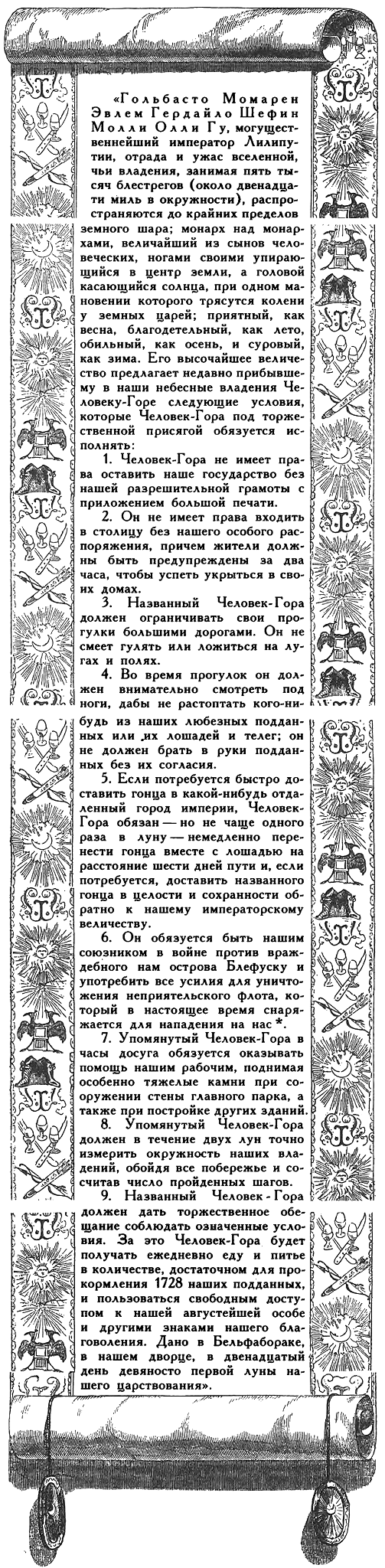 9. Названный Человек-Гора должен дать торжественное обещание соблюдать означенные условия. За это Человек-Гора будет получать ежедневно еду и питье в количестве, достаточном для прокормления 1728 наших подданных, и пользоваться свободным доступом к нашей августейшей особе и другими знаками нашего благоволения. Дано в Бельфабораке, в нашем дворце, в двенадцатый день девяносто первой луны нашего царствования».