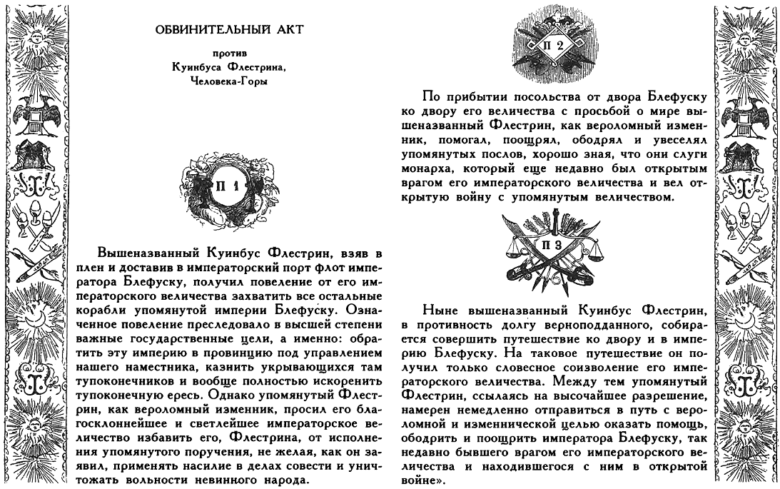 Ныне вышеназванный Куинбус Флестрин, в противность долгу верноподданного, собирается совершить путешествие ко двору и в империю Блефуску. На таковое путешествие он получил только словесное соизволение его императорского величества. Между тем упомянутый Флестрин, ссылаясь на высочайшее разрешение, намерен немедленно отправиться в путь с вероломной и изменнической целью оказать помощь, ободрить и поощрить императора Блефуску, так недавно бывшего врагом его императорского величества и находившегося с ним в открытой войне».