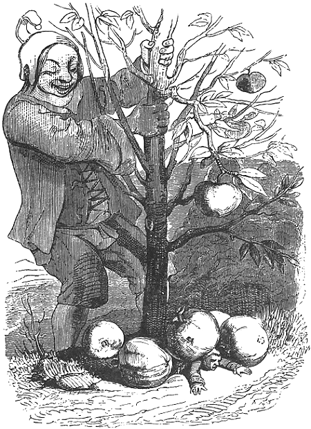 Глюмдальклич часто выносила меня в дорожном ящике в дворцовый сад. Иногда она вынимала меня из ящика и держала на руке или спускала на землю. Однажды, еще в то время, когда карлик жил при дворе, он пошел в сад следом за нами. Моя нянюшка спустила меня на землю возле карликовых яблонь. Тут же остановился и карлик. Заметив это, я не удержался и довольно плоско пошутил над тем, что и деревья и он одинаково карлики. В отместку злой шут подстерег, когда я проходил под одной из яблонь, и встряхнул ее. С десяток яблок величиной с хороший бочонок посыпалось на меня; одно из них угодило мне в спину и сшибло меня с ног. Я плашмя растянулся на земле.