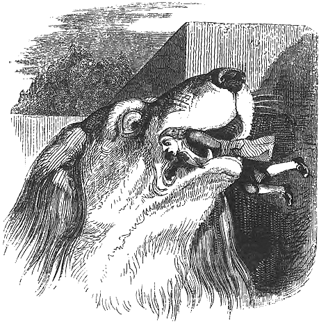 Глюмдальклич ушла куда-то по делу или в гости и заперла меня в своей комнате. Погода стояла жаркая, и окно комнаты было открыто, точно так же, как окна и дверь моего большого ящика. Я спокойно сидел у стола, погруженный в раздумье; внезапно я услышал, что кто-то вскочил через окно в комнату Глюмдальклич. Я очень испугался, но все же рискнул выглянуть из моего окошка.