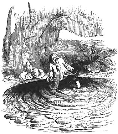 Раз во время этих упражнений случилось происшествие, едва не стоившее мне жизни. Когда паж опустил лодку в корыто, гувернантка Глюмдальклич любезно подняла меня, чтобы посадить в лодку. Но я как-то выскользнул у нее из пальцев и непременно упал бы на пол с высоты сорока футов. Только счастливая случайность спасла мне жизнь. При падении я зацепился за большую булавку в корсаже этой любезной дамы. Головка булавки прошла между рубашкой и поясом моих штанов, и я повис в воздухе… В эту минуту ко мне на помощь прибежала Глюмдальклич.
