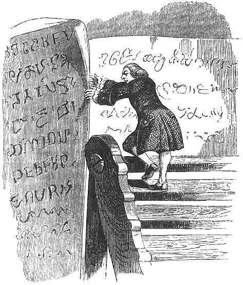 Искусство книгопечатания здесь, как и у китайцев, существует с незапамятных времен. Но библиотеки их не очень велики. Так, например, королевская библиотека, самая большая во всей стране, насчитывает не более тысячи томов, помещенных в галерее длиной в сто двадцать футов. Мне было разрешено свободно пользоваться книгами из этой библиотеки. Столяр королевы смастерил в одной из комнат Глюмдальклич деревянный станок высотой в двадцать пять футов. По своей форме этот станок напоминал стремянку, каждая ступенька которой имела пятьдесят футов длины. Станок устанавливался с таким расчетом, чтобы нижняя ступенька находилась на расстоянии десяти футов от стены комнаты. Книга, которую я желал читать, приставлялась к стене; я взбирался на самую верхнюю ступеньку лестницы и, повернув лицо к книге, начинал чтение с верха страницы, двигаясь вдоль ступеньки слева направо. Когда я доходил до строк, находившихся ниже уровня моих глаз, я спускался на следующую ступеньку, пока не заканчивал чтения страницы. Затем я снова поднимался на верхнюю ступеньку и прочитывал таким же образом другую страницу. Листы книги я переворачивал обеими руками. Это было не слишком трудно, так как бумага не была толще нашего картона, а самая большая книга имела в длину всего от восемнадцати до двадцати футов.