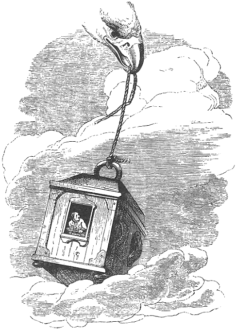 Прошло несколько минутки и я заметил, что шум усилился, а взмахи крыльев участились. Мой ящик закачался из стороны в сторону, как вывеска на столбе в ветреный день. Я услышал у себя над головой злобный клекот и какие-то удары. Вдруг я почувствовал, что падаю отвесно вниз с такой невероятной скоростью, что у меня захватило дух. Раздался страшный всплеск. Он отдался в моих ушах сильнее, чем шум Ниагарского водопада. На мгновенье я погрузился в глубокий мрак; затем мой ящик начал подниматься, и в верхние створы окна я увидел свет. Тут я понял, что упал в море. По-видимому, на моего орла напали два или три соперника, надеясь отнять у него добычу. Во время битвы орел выпустил ящик из клюва. Тяжелые железные пластины на дне ящика помогли ему сохранить во время падения равновесие и не дали разбиться о поверхность воды. Стенки ящика были плотно пригнаны, двери отворялись не на петлях, а поднимались и опускались, как подъемные окна. Словом, моя комната была закрыта наглухо, и воды в нее проникло очень немного. Я с трудом вылез из гамака и отважился отодвинуть маленькую дверцу в крышке, чтобы впустить свежего воздуха, от недостатка которого я почти задыхался.