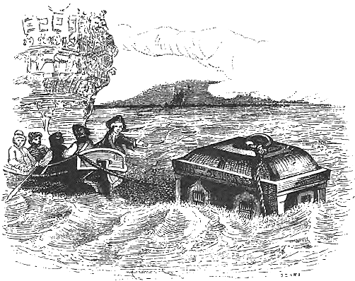 Так как море было спокойно, то он несколько раз объехал вокруг ящика и увидел в нем окно с железными решетками. На глухой стенке ящика он заметил две крепкие скобы. Капитан приказал пропустить канат в одну из этих скоб и тащить мой сундук (как он его называл) на буксире к кораблю. Когда это было исполнено, капитан велел привязать другой канат к кольцу, прикрепленному на крыше, и попытаться поднять сундук на палубу, но сундук оказался настолько тяжелым, что соединенными усилиями всей команды удалось поднять его только на два или три фута. Капитан сказал, что они увидели мою палку с платком, просунутую в дыру, и решили, что в сундуке заключен какой-то несчастный.