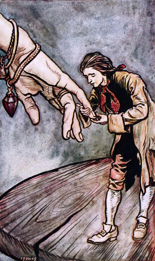 Непрерывные ежедневные упражнения, продолжавшиеся в течение нескольких недель, сильно подорвали мое здоровье. Чем более я доставлял выгод моему хозяину, тем ненасытнее он становился. Я совсем потерял аппетит и стал похож на скелет. Заметя это, фермер пришел к заключению, что я скоро умру, и потому решил извлечь из меня все, что только возможно. Когда он пришел к такому выводу, к нему явился слардрал, или королевский адъютант, с требованием немедленно доставить меня во дворец для развлечения королевы и придворных дам. Некоторые из последних меня уже видели и распустили необыкновенные слухи о моей красоте, хороших манерах и большой сообразительности. Ее величество и ее свита пришли от меня в неописуемый восторг. Я упал на колени и попросил позволения поцеловать ногу ее величества, но королева милостиво протянула мне мизинец (после того как меня поставили на стол), который я обнял обеими руками и с глубоким почтением поднес к губам. Она задала мне несколько общих вопросов относительно моей родины и путешествий, на которые я ответил как только мог короче и отчетливее. Затем она спросила, буду ли я доволен, если меня оставят во дворце. Я низко поклонился королеве и скромно ответил, что я раб своего хозяина, но что если бы я был свободен распоряжаться своей судьбой, то с радостью посвятил бы свою жизнь служению ее величеству. Тогда королева спросила моего хозяина, согласен ли он продать меня за хорошую цену. Так как мой хозяин боялся, что я не проживу и месяца, то очень обрадовался случаю отделаться от меня и запросил тысячу золотых, которые тут же ему были отсчитаны. Каждый из этих золотых равнялся восьмистам мойдорам, но если принять во внимание соотношение между всеми предметами этой страны и Европы, а также высокую цену золота там, то эта сумма едва окажется равной тысяче английских гиней[60]60