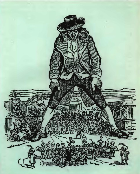 По некоторым причинам было бы неуместно утруждать читателя подробным описанием наших приключений в этих морях; довольно будет сказать, что при переходе в Ост-Индию мы были отнесены страшной бурей к северо-западу от Вандименовой Земли [489]. Согласно наблюдениям, мы находились на 30°2′ южной широты. Двенадцать человек нашего экипажа умерли от переутомления и дурной пищи; остальные были крайне обессилены. 5 ноября (начало лета в этих местах) стоял густой туман, так что матросы только на расстоянии полукабельтова от корабля заметили скалу; но ветер был такой сильный, что нас понесло прямо на нее, и корабль мгновенно разбился. Шестерым из экипажа, в том числе и мне, удалось спустить лодку и отойти от корабля и скалы. По моим расчетам, мы шли на веслах около трех лиг, пока совсем не выбились из сил, так как были переутомлены уже на корабле. Поэтому мы отдались на волю волн, и через полчаса лодка была опрокинута внезапно налетевшим с севера порывом ветра. Что́ сталось с моими товарищами по лодке, а равно и с теми, которые нашли убежище на скале или остались на корабле, не могу сказать; думаю, что все они погибли. Что касается меня самого, то я поплыл куда глаза глядят, подгоняемый ветром и приливом. Я часто опускал ноги, но не мог нащупать дно; когда я совсем уже выбился из сил и неспособен был больше бороться с волнами, я почувствовал под ногами землю, а буря тем временем значительно утихла. Дно в этом месте было так покато, что мне пришлось пройти около мили, прежде чем я добрался до берега; по моим предположениям, это случилось около восьми часов вечера. Я прошел еще с полмили, но не мог открыть никаких признаков жилья и населения; или, по крайней мере, я был слишком слаб, чтобы различить что-нибудь. Я чувствовал крайнюю усталость; от усталости, жары, а также от выпитой еще на корабле полупинты коньяку меня сильно клонило ко сну. Я лег на траву, которая была здесь очень низкая и мягкая, и заснул так крепко, как не спал никогда в жизни. По моему расчету, сон мой продолжался около девяти часов, потому что, когда я проснулся, было уже совсем светло. Я попробовал встать [490], но не мог шевельнуться; я лежал на спине и обнаружил, что мои руки и ноги с обеих сторон крепко привязаны к земле и точно так же прикреплены к земле мои длинные и густые волосы. Равным образом я почувствовал, что мое тело, от подмышек до бедер, опутано целой сетью тонких бечевок. Я мог смотреть только вверх; солнце начинало жечь, и свет его ослеплял глаза. Кругом меня слышался какой-то глухой шум, но положение, в котором я лежал, не позволяло мне видеть ничего, кроме неба. Вскоре я почувствовал, как что-то живое задвигалось у меня по левой ноге, мягко поползло по груди и остановилось у самого подбородка. Опустив глаза как можно ниже, я различил перед собою человеческое существо, ростом не более шести дюймов, с луком и стрелой в руках и колчаном за спиной. В то же время я почувствовал, как вслед за ним на меня взбирается, по крайней мере, еще около сорока подобных же (как мне показалось) созданий. От изумления я так громко вскрикнул, что они все в ужасе побежали назад; причем некоторые из них, как я узнал потом, соскакивая и падая с моего туловища на землю, получили сильные ушибы. Однако скоро они возвратились, и один из них, отважившийся подойти так близко, что ему было видно все мое лицо, в знак удивления по