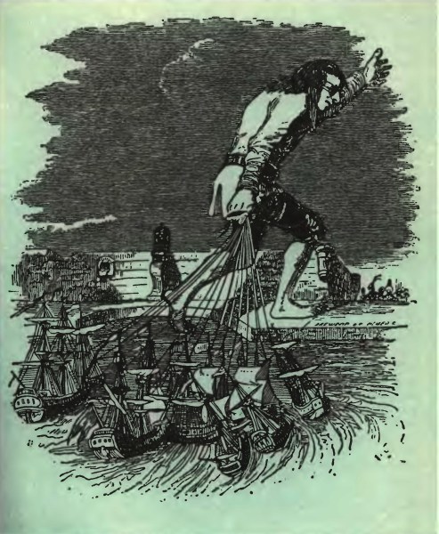 Империя Блефуску есть остров, расположенный на северо-северо-восток от Лилипутии и отделенный от нее лишь проливом, шириною в восемьсот ярдов. Я еще не видел этого острова; узнав же о предполагаемом нашествии, старался не показываться в той части берега из опасения быть замеченным с кораблей неприятеля, который не имел никаких сведений о моем присутствии, так как во время войны всякие сношения между двумя империями были строго запрещены под страхом смертной казни и наш император наложил эмбарго на выход всех без исключения судов из гаваней. Я сообщил его величеству составленный мною план захвата всего неприятельского флота, который, как мы узнали от наших разведчиков, стоял на якоре, готовый поднять паруса при первом попутном ветре. Я осведомился у самых опытных моряков относительно глубины пролива, часто ими измерявшейся, и они сообщили мне, что при высокой воде глубина эта в средней части пролива равняется семидесяти глюмглеффам, – что составляет около шести европейских футов, – во всех же остальных местах она не превышает пятидесяти глюмглеффов.Я отправился на северо-восточный берег, расположенный напротив Блефуску, лег за бугорком и направил свою подзорную трубу на стоявший на якоре неприятельский флот, в котором насчитал до пятидесяти боевых кораблей и большое число транспортов. Возвратившись домой, я приказал (у меня было на то полномочие) доставить мне как можно больше самого крепкого каната и железных брусьев. Канат оказался толщиною в бечевку, а брусья величиной в нашу вязальную иголку. Чтобы придать этому канату большую прочность, я свил его втрое и с тою же целью скрутил вместе по три железных бруска, загнув их концы в виде крючков. Прикрепив пятьдесят таких крючков к такому же числу веревок, я возвратился на северо-восточный берег и, сняв с себя кафтан, башмаки и чулки, в кожаной куртке вошел в воду за полчаса до прилива. Сначала я быстро двинулся вброд, а у середины проплыл около тридцати ярдов, пока снова не почувствовал под собою дно; таким образом, меньше чем через полчаса я достиг флота. Увидев меня, неприятель пришел в такой ужас, что попрыгал с кораблей и поплыл к берегу, где его собралось не менее тридцати тысяч. Тогда, вынув свои снаряды и зацепив нос каждого корабля крючком, я связал все веревки в один узел. Во время этой работы неприятель осыпал меня тучей стрел, и многие из них вонзились мне в руки и лицо. Помимо ужасной боли, они сильно мешали моей работе. Больше всего я боялся за глаза и наверное лишился бы их, если бы не придумал тотчас же средства для защиты. Среди других необходимых мне мелочей у меня сохранились очки, которые я держал в секретном кармане, ускользнувшем, как я уже заметил выше, от внимания императорских досмотрщиков. Я надел эти очки и крепко привязал их. Вооружась таким образом, я смело продолжал работу, несмотря на стрелы неприятеля, которые хотя и попадали в стекла очков, но не причиняли им особого вреда. Когда все крючки были прилажены, я взял узел в руку и начал тащить; однако ни один из кораблей не тронулся с места, потому что все они крепко держались на якорях. Таким образом, мне оставалось совершить самую опасную часть моего предприятия. Я выпустил веревки и, оставя крючки в кораблях, смело обрезал ножом якорные канаты, причем более двухсот стрел угодило мне в лицо и руки. После этого