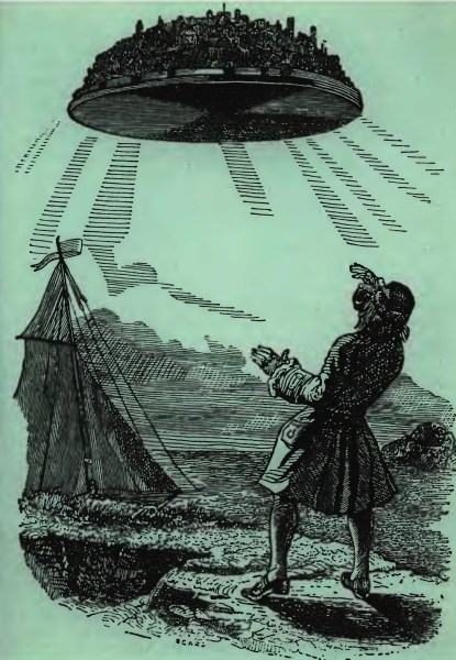 Естественная любовь к жизни наполнила меня чувством радости, и у меня явилась надежда, что это приключение так или иначе поможет мне выйти из пустынного места и отчаянного положения, в котором я находился. Но, с другой стороны, читатель едва ли будет в состоянии представить себе, с каким удивлением смотрел я на парящий в воздухе остров, населенный людьми, которые (как мне казалось) могли поднимать и опускать его или направлять вперед по своему желанию. Но я не был тогда расположен философствовать по поводу этого явления, и для меня представляло гораздо больше интереса наблюдать, в какую сторону двинется остров, так как на мгновение он как будто остановился. Скоро, однако, он приблизился ко мне, и я мог рассмотреть, что его стороны окружены несколькими галереями, расположенными уступами и соединенными между собой на известных промежутках лестницами, позволявшими переходить с одной галереи на другую. На самой нижней галерее я увидел нескольких человек, из которых одни ловили рыбу длинными удочками, а другие смотрели на эту ловлю. Я стал махать ночным колпаком (моя шляпа давно уже износилась) и платком по направлению к острову, и, когда он приблизился еще больше, я закричал во всю глотку. Затем, вглядевшись внимательнее, я увидел, что на обращенной ко мне стороне острова собирается толпа. Судя по тому, что находившиеся тут люди указывали на меня пальцами и оживленно жестикулировали, я заключил, что они заметили меня, хотя и не отвечали на мои крики. Я видел только, что из толпы отделились четыре или пять человек и поспешно стали подниматься по лестницам на вершину острова, где и исчезли. Я догадывался, и совершенно основательно, что эти люди были посланы к какой-нибудь важной особе за распоряжениями по поводу настоящего случая.