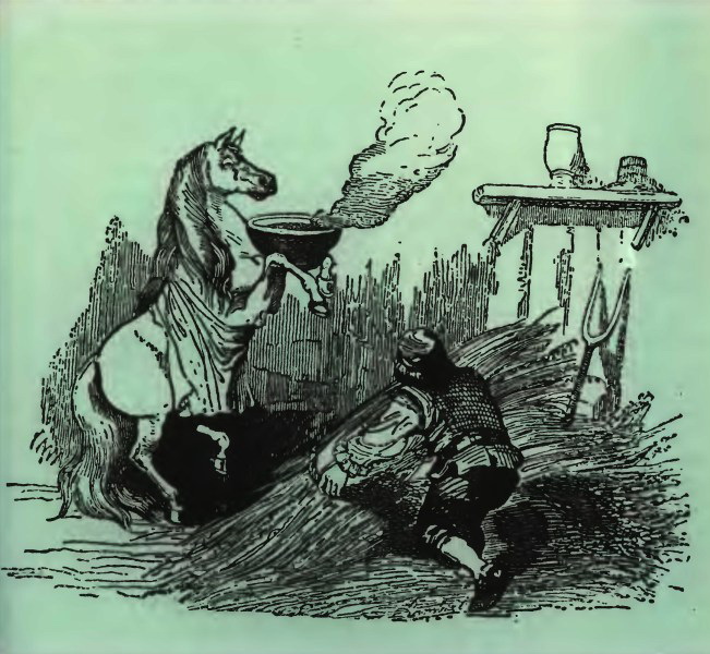 Около полудня к дому подкатила особенного устройства повозка, которую тащили подобно санкам четыре еху.В повозке сидел старый конь, по-видимому, знатная особа; он сошел на землю, опираясь на задние ноги, потому что передняя левая нога у него была повреждена. Этот конь приехал обедать к моему хозяину, который принял его с большой любезностью. Они обедали в лучшей комнате, и на второе блюдо им подали овес, варенный в молоке; гость ел это кушанье в горячем виде, а остальные лошади – в холодном. Их ясли расположены были кругообразно посреди комнаты и разгорожены на несколько отделений, возле которых все и уселись на подостланную солому. Над яслями помещалась большая решетка с сеном, разгороженная на столько же отделений, как и ясли, так что каждый конь и каждая кобыла ели отдельно свои порции сена и овсяной каши с молоком, очень благопристойно и аккуратно. Жеребята держали себя очень скромно, а хозяева были крайне любезны и предупредительны к своему гостю. Серый велел мне подойти к нему и завел со своим другом длинный разговор обо мне, как я мог заключить по тому, что гость часто поглядывал на меня и собеседники то и дело произносили слово еху.