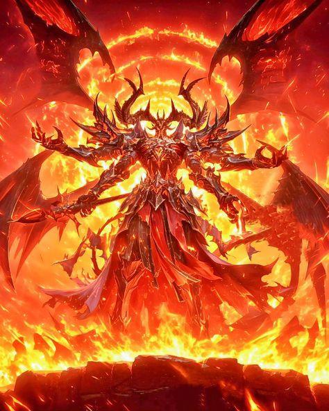 Сияние прекратилось, и на месте старика возникло существо, облаченное в массивные доспехи с шипами. У него было четыре руки, огромные крылья, и его рога придавали ему зловещий вид. Вокруг него танцевали языки пламени и раскаленные кольца, создавая атмосферу жгучего страха.