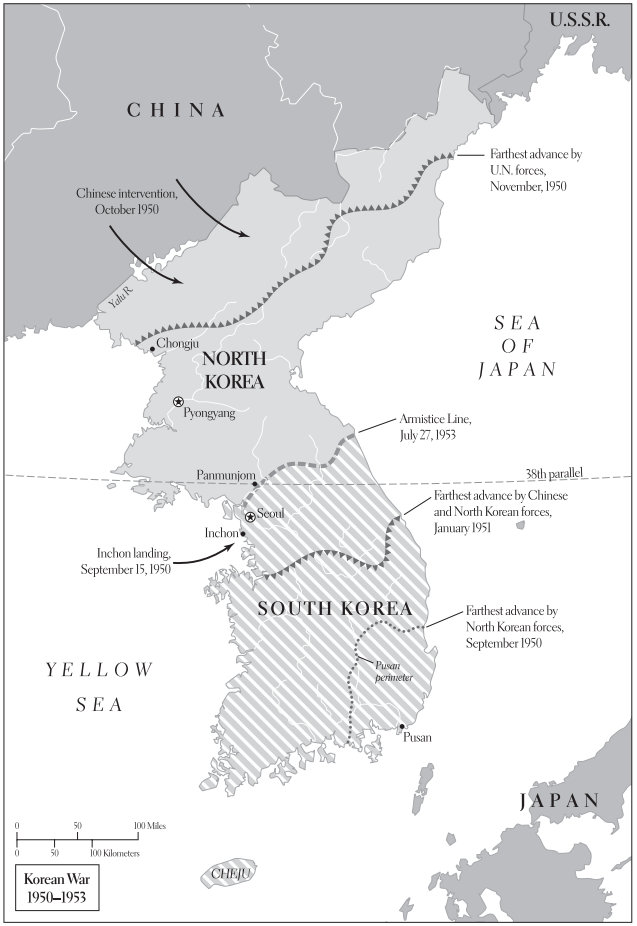 Вмешательство Китая в конце ноября 1950 года привело к тому, что, по горькому признанию Макартура, это была новая и другая война. По словам Мао, Китай и Корея были «близки, как губы к зубам», и китайцы не могли не рассматривать продвижение вражеских войск к своей границе как угрозу своему младенческому государству и проверку своего авторитета.[1599] Возможно, Мао чувствовал определенные обязательства перед корейскими коммунистами, которые оказали ему жизненно важную поддержку во время гражданской войны в Китае. Он также рассматривал интервенцию как способ повысить статус Китая за счет победы над «высокомерными» Соединенными Штатами, поддержать революционный импульс, возникший в ходе гражданской войны, и узаконить положение партии внутри Китая.[1600] Сталин пытался прикрыть свой катастрофический просчет, поощряя китайское вмешательство и обещая поддержку с воздуха (от которой он позже отказался). Это решение, очевидно, вызвало ожесточенные споры в китайском Политбюро, но Мао взял верх. Вскоре после того, как американские войска отпраздновали День благодарения у реки Ялу, в войну вступили более двухсот тысяч китайских солдат.[1601] Макартур по глупости подверг свои армии опасности, разделив их. В жуткую холодную погоду и в ужасных условиях войска ООН отступили в ходе операции, которую американские войска назвали Operation Bugout, – стремительного, бесславного и страшно дорогостоящего отступления в жуткую холодную погоду, которое должно было закончиться к югу от 38-й параллели. Китайцы и северокорейцы поклялись объединить Корею.