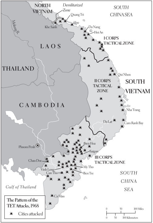 Через неделю после инцидента в Пуэбло Северный Вьетнам и НФЛ начали крупнейшее наступление за всю войну. Нанеся удар в Тет, начало нового года по лунному календарю и самый праздничный из вьетнамских праздников, они перенесли свои атаки из сельской местности в ранее безопасные городские районы Южного Вьетнама. В Сайгоне, центре власти США, они нанесли удары по аэропорту, президентскому дворцу и, что особенно важно, по американскому посольству. Застигнутые врасплох, американские и южновьетнамские войска отразили первые атаки, понесли огромные потери и отвоевали утраченные позиции. Однако внезапность и масштабность наступления оказали огромное влияние на Соединенные Штаты. Наблюдая за событиями в ночных телевизионных новостях, публика, которой внушали, что Соединенные Штаты побеждают в войне, была шокирована и глубоко разочарована. Один советник LBJ позже вспоминал, что в Белом доме во время обсуждений царила «атмосфера мрака»; другой сравнил настроение с тем, что было в 1861 году после первой битвы при Булл-Ран.[1904]