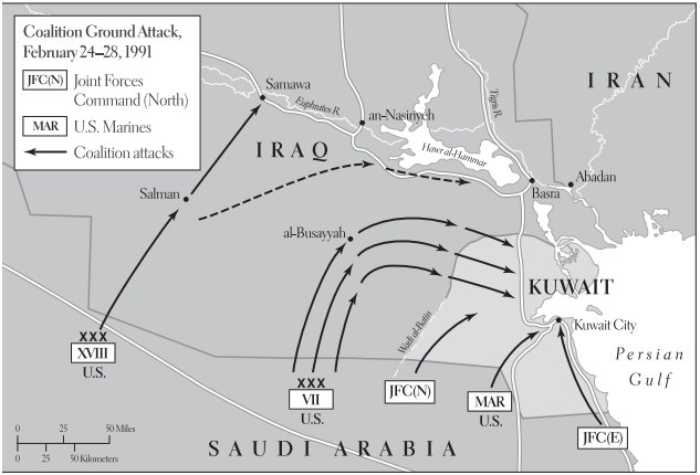 Начавшись 16 января 1991 года, операция «Буря в пустыне» явила миру ослепительную демонстрацию современной, высокотехнологичной военной мощи. В течение пяти недель ВВС и ВМС наносили удары по Ираку крылатыми ракетами с бомбардировщиков В–52, совершавших тридцатичасовые перелеты из Луизианы, ракетами «Томагавк», выпущенными с кораблей в Персидском заливе, и бомбами с лазерным наведением, сброшенными самолетами «Стелс» F–117. В первую очередь удары наносились по коммуникационным сетям, электросетям и авиабазам Ирака. Бомбардировки были не такими точными, как это показывали по телевидению. Сопутствующий ущерб и жертвы среди мирного населения оказались гораздо серьезнее, чем считалось в то время. Но воздушная война подорвала боеспособность Ирака. Затем самолеты коалиции «смягчили» концентрацию иракских войск в Кувейте. Вторая фаза войны началась 24 февраля, когда американские морские пехотинцы с баз в Саудовской Аравии атаковали иракские войска в Кувейте. Затем армейские подразделения совершили «левый крюк» через западную пустыню, чтобы поймать противника в ловушку. Коалиционные силы нанесли огромные потери уже деморализованным иракским сухопутным войскам. Через сто часов боевые действия прекратились, что, по всей видимости, стало ошеломляющей победой коалиции и особенно Соединенных Штатов.[2314]