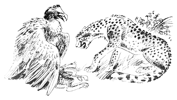 С быстротой молнии, прежде чем орел успел схватить мертвого зайца и улететь, гепард подскочил к нему, выхватил у него из-под лап добычу, уволок ее в кусты и жадно стал пожирать эти искромсанные, окровавленные останки.