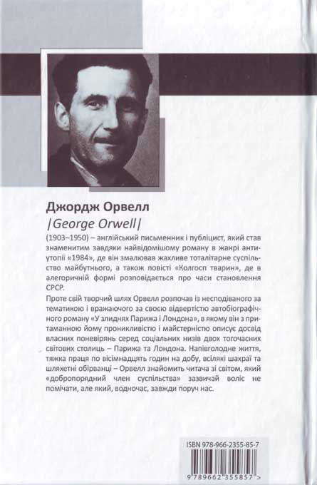 Проте свій творчий шлях Орвелл розпочав із несподіваного за тематикою і вражаючого за своєю відвертістю автобіографічного роману «У злиднях Парижа і Лондона», в якому він з притаманною йому проникливістю і майстерністю описує досвід власних поневірянь серед соціальних низів двох тогочасних світових столиць – Парижа та Лондона. Напівголодне життя, тяжка праця по вісімнадцять годин на добу, всілякі шахраї та шляхетні обірванці – Орвелл знайомить читача зі світом, який «добропорядний член суспільства» зазвичай воліє не помічати, але який, водночас, завжди поруч нас.