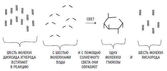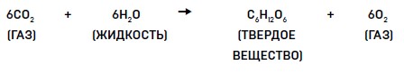 Растения используют солнечную энергию, чтобы преобразовать шесть молекул углекислого газа и шесть молекул воды в молекулу глюкозы и шесть молекул кислорода.