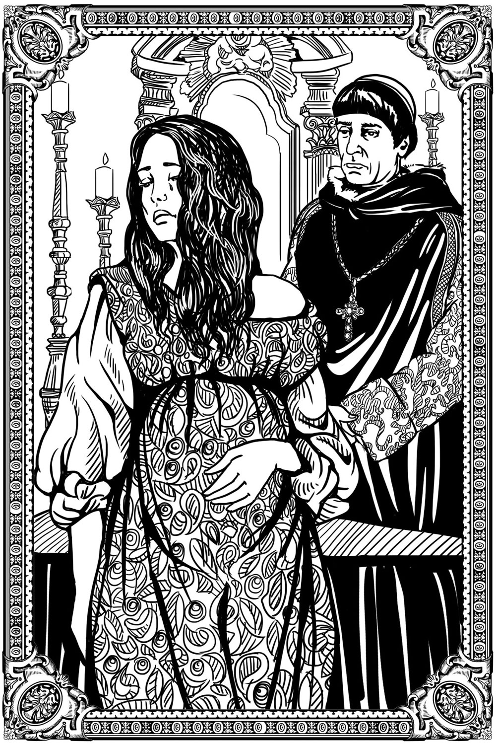 И дворянин повел проповедника в комнату, где на кушетке лежала его жена. Увидав его, она поразилась, ибо нисколько не сомневалась, что это именно он ее избивал, и пришла в страшный гнев. Но присутствие мужа ее сдержало, она опустила глаза и умолкла. Тогда муж ее сказал святому отцу: