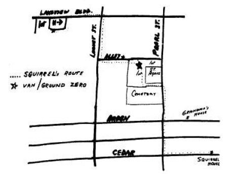 В 5:58 пополудни К_ П_ покинул «Хампти-Дампти» и пересек улицу, направившись к фургону, незаметно припаркованному позади продуктового магазина на Лэйквью. Оживленное местечко в этот пятничный вечер. Минуту сидел в фургоне, прогревая мотор, потом выехал на дорогу в восточном направлении, и вскоре передо мной оказывается БЕЛЬЧОНОК, он крутит педали своего велосипеда на восток по Лэйквью, а я еду следом на безопасном расстоянии, придерживаясь правой полосы, медленно, будто ищу, где припарковаться. Наблюдаю, как БЕЛЬЧОНОК направляется на юг, как обычно, потом на узкую боковую улочку Локуст, и отстаю, когда он сворачивает в односторонний переулок (параллельный Лэйквью, на полквартала глубже) и движется на восток к стоянке позади Западной церкви Святой Агнессы, минуя по пути ОТПРАВНУЮ ТОЧКУ (где при похищении будет стоять фургон). Вместо этого я прибавляю скорости, на Перл-Стрит поворачиваю направо, то есть на юг, проезжаю церковь и прилегающее кладбище, и вот, спустя минуту или около, в моем зеркале заднего вида снова оказывается БЕЛЬЧОНОК, едет себе и ни о чем не догадывается! Как будто он в кино, и сам об этом не знает. Зато я знаю. Торможу на обочине и пропускаю его вперед. Его сильные ноги крутят педали, его гибкая спина изогнута, словно в экстазе! И я медленно за ним следую, пересекаю Арден-Стрит (через полтора квартала на восток отсюда живет бабушка) и еще две улицы до Сидар-Стрит (через полтора квартала на восток отсюда живет БЕЛЬЧОНОК), потом БЕЛЬЧОНОК поворачивает на Сидар, а я продолжаю ехать на юг по Перл. Только между нами. Наш маленький секрет.