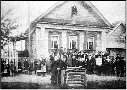 Деревенские жители у дома разбойника Чуркина в деревне Барская Богородского уезда. Брат разбойника стоит у колодца. Любительское фото нач. XX в.