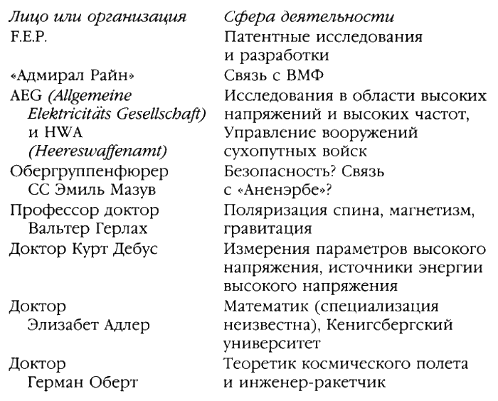 Ниже приводится перечень лиц и организаций наряду с указанием сфер их деятельности и взаимосвязями, составленный Витковским, который может пролить свет на возможное содержание проекта «Колокол»: