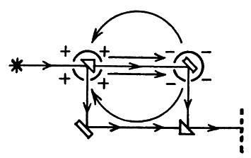 Если один протон и один электрон образуют систему эфирного тока, изображенную на приведенном выше рисунке, то много протонов и много электронов должны образовывать подобную систему, но в большем масштабе. Для того чтобы провести испытание на присутствие таких эфирных токов, может быть использован аппарат, изображенный на приведенном ниже рисунке. Интерферометр примерно квадратной формы состоит из полых металлических сфер или цилиндров, расположенных над двумя из углов. Эти сферы или цилиндры заряжаются электростатически, как показано на рисунке, дабы вдоль одного из раздвоенных лучей имелся градиент электростатического потенциала. Если существует поток эфира вдоль электростатических силовых линий, показанных короткими прямыми стрелками, должно происходить смещение интерференционных полос под воздействием электростатического поля при условии, что эфир течет со скоростью, достаточной для того, чтобы производить заметный эффект [405]405