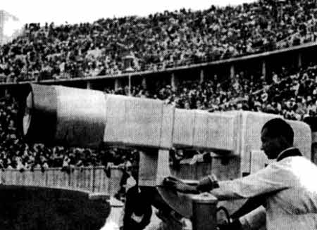 Хорошо известно, что на Берлинской олимпиаде 1936 года была организована первая телевизионная трансляция спортивных соревнований в прямом эфире для широкой публики. На приведенной фотографии представлена одна из громоздких телевизионных камер, которые были установлены в разных точках вокруг олимпийского стадиона на аэродроме «Темпельхоф» в Берлине.