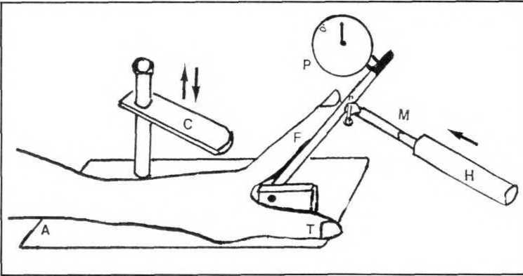Н – Ручка измерительной шкалы. На нее нажимает указательный палец под прямым углом. Когда ручка достигает отметки М, давление пальца составляет 1 кг – указательный палец.