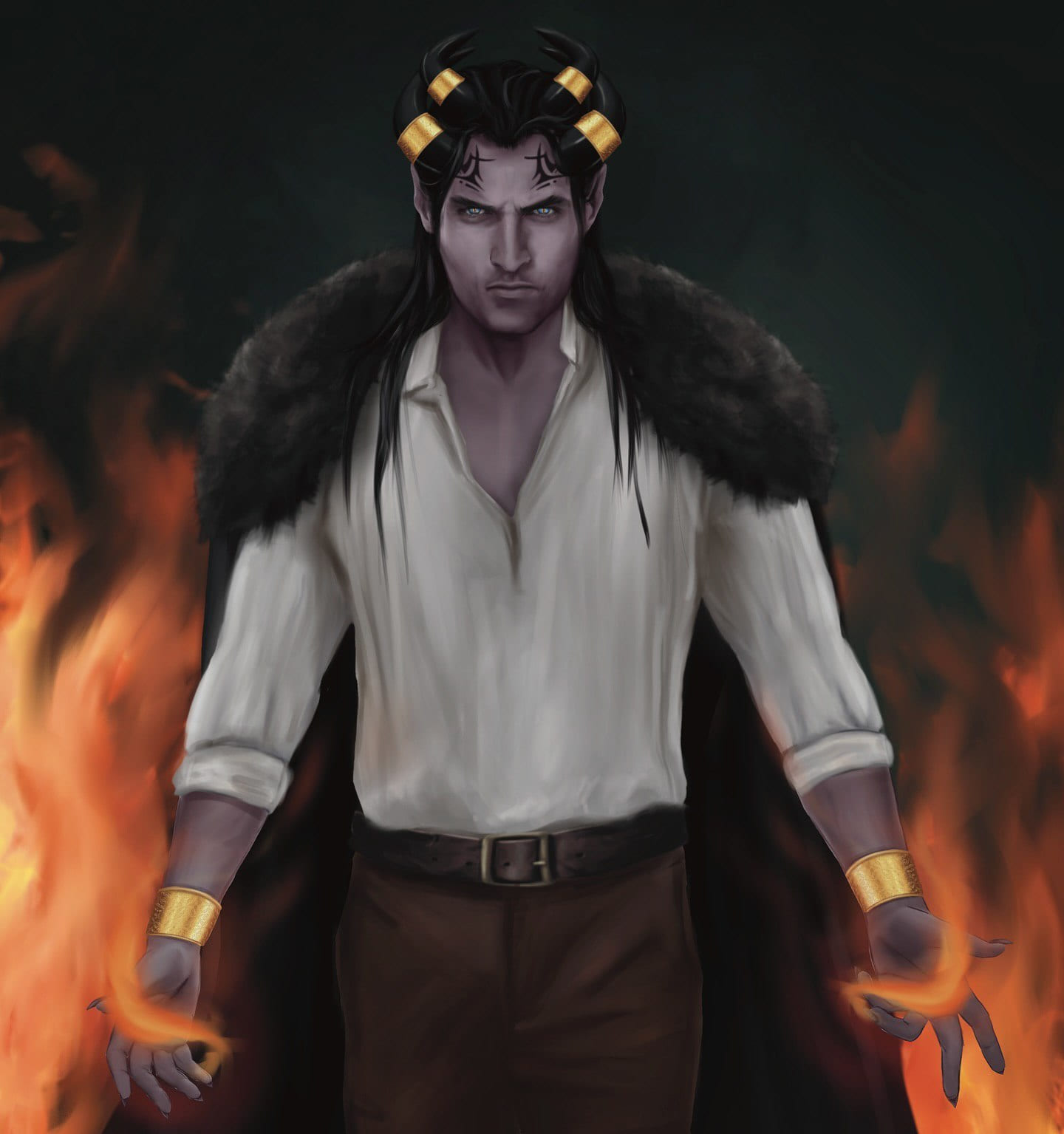 Принц Торвин стоял на одной высоте со своим жрецом, Валлоном. Однако его чёрные крылья возвышались выше, сверкая на солнце красным отливом. Его золотистые волосы были заплетены в тугие косы по бокам, спускаясь к растрёпанным прядям, падающим ниже плеч. Четыре гладких рога элегантно изгибались назад над его головой.