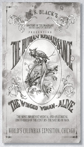 Текст на афише:. Шоу доктора Блэка. Анатомия воображаемых существ и кунсткамера представляют «Возрождение человечества». Живая крылатая женщина. Самые важные медицинские и анатомические открытия века – природа человека. Всемирная Колумбийская выставка, Чикаго