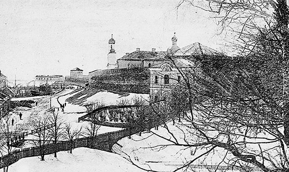 Мост, перекинутый через Волхов против Ярославова дворища, соединял Торговую сторону с Софийской, где находилась главная святыня Великого Новгорода – Софийский собор. Здесь же были владычний дом и двор. При церкви Св. Софии, у владыки на сенях, были главный суд и управление, здесь же на полатях хранились общественная казна и все законы, постановления, договоры и грамоты. Площадь Софийского собора была всегда окружена стенами, сначала деревянными, а потом каменными с воротами и башнями. Здесь и был собственно город, или детинец новгородский. Такие города, или детинцы, были во всех поселениях древних славян. В них помещались во время вражеских нападений женщины, дети и старики, сюда же свозилось все имущество. Но, судя по старым планам и изображениям древнего Новгорода, он весь был окружен даже двойным рядом стен, а также окопами и рвами. Остатки рвов и окопов сохранились до сих пор, а от стен остались только стены детинца да одинокая башня на Софийской стороне. На берегу Волхова, на большом расстоянии от детинца, стоит она, как бы оторванная от его стены и отброшенная в сторону.