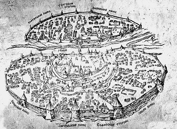Кроме разделения на две стороны, Новгород Великий делился еще на пять концов. Древние названия концов указывают на то, как складывался город по мере разрастания и как к ядру его – поселению ильменских славян – примешивались поселения пришлых людей. Торговая сторона состояла из двух больших концов – Словенского, где жили, вероятно, древние славяне, и Плотницкого. Название последнего указывает на ремесло, которым с давних пор занимались новгородцы, пользуясь обилием строевого материала. Три конца Софийской стороны полукружием примыкали к Околотку – местности вокруг детинца. Один из концов носил название Гончарского и Людина, очевидно потому, что там жили гончары или горшечники – простые люди, называвшиеся так в отличие от бояр или военной дружины, живших обыкновенно вокруг детинца. Загородный конец был, вероятно, сначала за чертой города и уже позднее присоединился к нему. Происхождение названия третьего конца Неревского неизвестно в точности. Предполагают, что здесь жили в прежние времена литовцы, так как корень слова «Неревский» находят в их языке.