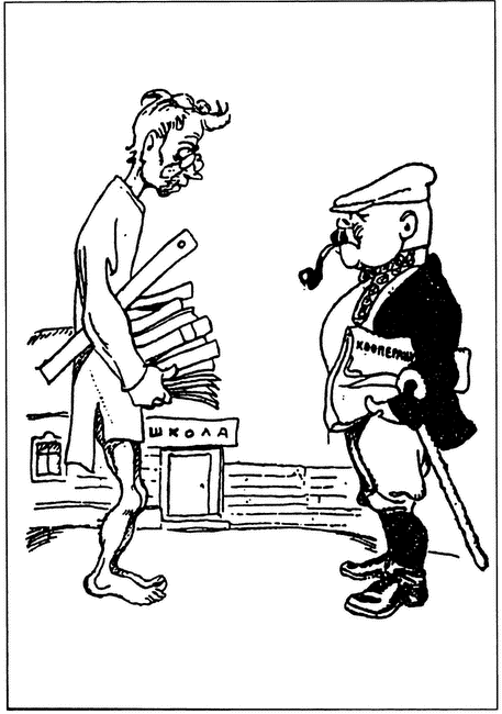 Даже зная обо всех этих трудностях, центральные власти, однако, убеждали учителей, что во всех их бедах виноваты местные организации и чиновники, которые не выполняют принятые партийными вождями решения{261}. Экономический конфликт местного уровня отобразила карикатура в газете «Известия». На ней худой, плохо одетый и босой учитель, сжимающий стопку учебников и тетрадей, взывает к упитанному, хорошо одетому и надменному чиновнику из местного кооператива (см. рис. 3.1). Центральные власти стремились направить возмущение народа на местных чиновников и отвлечь внимание от катастрофических последствий экономической политики. Босые ноги и угодливая поза учителя на карикатуре не только отражали реальное положение дел, но и символизировали неспособность учителей достичь того материального положения и социального статуса, которого они, по их представлениям, заслуживали.