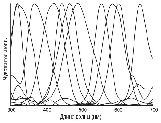 Каждая кривая соответствует одному из 12 типов фоторецепторов в глазе рака-богомола. Пик кривой соответствует длине световой волны, к которой данный тип наиболее чувствителен
