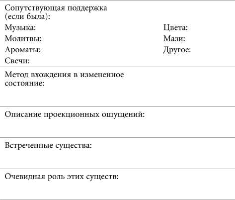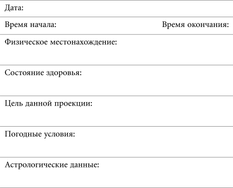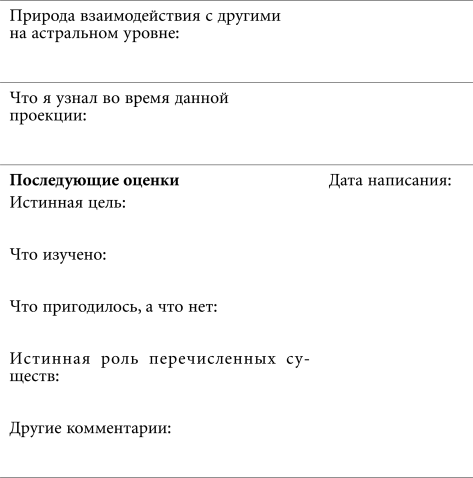 Ниже приводится образец формы для заполнения, которую вы можете скопировать и преобразовать для использования в астральном журнале. Пожалуйста, обратите внимание, что последняя графа предназначена для записей в последующие дни, когда появится время для того, чтобы обдумать астральные ощущения и упорядочить их в соответствии с вашими общими духовными целями.