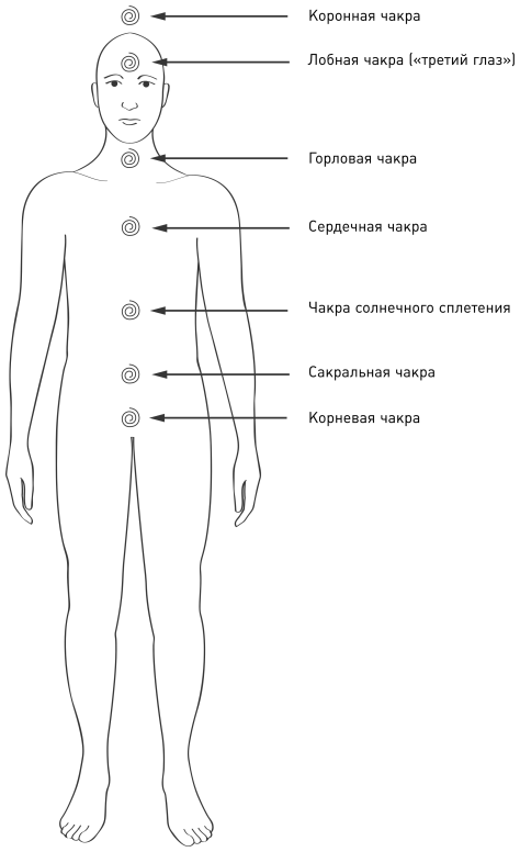 На теле существуют семь основных энергетических центров, которые соответствуют различным умственным, эмоциональным и физиологическим функциям тела. На рисунке 3 изображены места расположения чакр. Большинство людей не осознают, что через эти энергетические центры ежедневно входят и выходят экстрасенсорные сообщения и энергия. Мы можем обнаружить намеки на это в метафорических высказываниях, когда говорим: «пучит живот», «болит сердце», «комок в горле» или «внутренности наизнанку выворачиваются». Эти участки тела соответствуют расположению чакр.