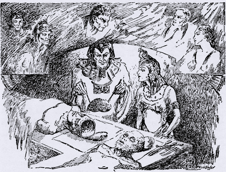 Мы отправились в имение Кахотепа – квадратный кирпичный дом, окружённый высокой стеной, за которой располагались зелёные сады, беседки и бассейн. Когда мы подошли к двери, из неё внезапно выскочило с полдюжины вооружённых слуг и окружили нас. Затем из квадратного жилища вышли двое: высокий, могучий египтянин с насмешливыми глазами и женщина, которую я видел.