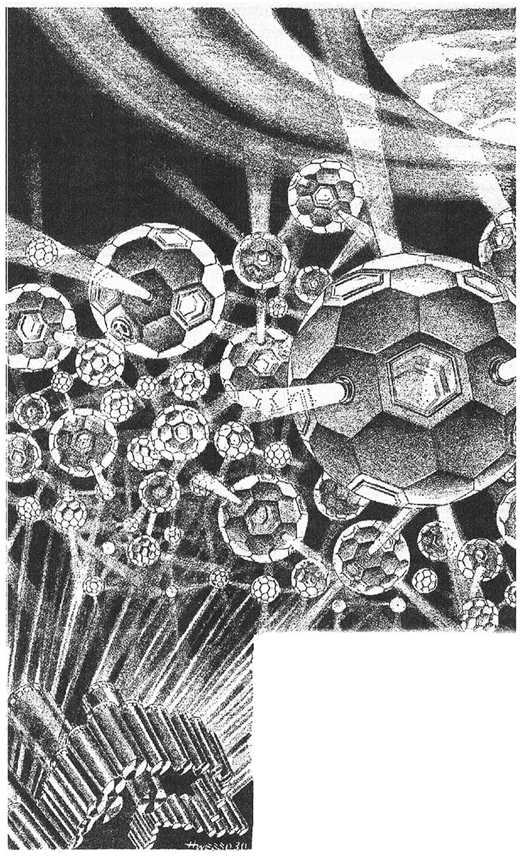 Два флота сплелись в смертельном танце битвы, цилиндры и многогранники, направо и налево, разили друг друга лучами. Наш корабль мчался во главе строя, когда Марлин отдал приказ двигаться к Сатурну. Я вел корабль. Уайтли быстро щелкал переключателями на пульте управления наших генераторов для поддержания постоянной мощности и скорости, Рэндалл разил врагов лучами. Наши и вражеские корабли обменивались ударами, стремительными, словно молнии! Бой занял, на самом деле, несколько мгновений, но мне эти мгновения показались вечностью, вихрем разрушения, бушевавшим в пустоте вне времени. Вскоре мне стало понятно, что битва смещается в район колец, желтая сфера Сатурна уже заслонила половину небес. Уайтли сквозь рёв генераторов прокричал Марлину: