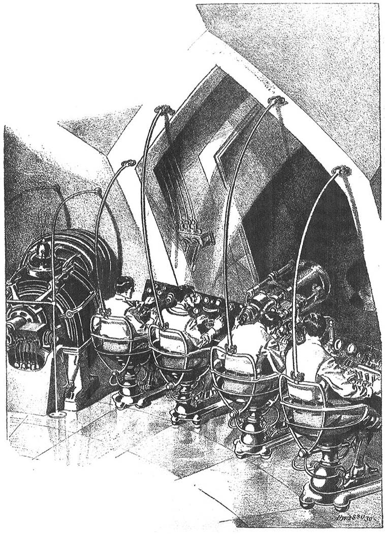 Слева от пульта управления размещалась панель циферблатов и переключателей четырех генераторов. Сами генераторы – сверкающие металлические кубы – размещались в противоположной части внутреннего пространства космолета и в качестве источника энергии использовали супербатареи Ньюсона-Конетти. Работая от этих батарей, каждая из которых мощностью превосходила крупную электростанцию, эти кубы генерировали могучий силовой луч, по сравнению с давлением которого обычное световое давление – ничто. Излучение по толстым черным волноводам, скрытым между двойными стенками корабля, подавалось к шести дюзам – черным отверстиям в шести точках сверкающего корпуса. При помощи этих лучей мы могли разогнаться почти до скорости света!
